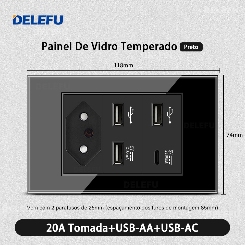 DELEFU 4*2 Preto Temperado Vidro Brasileiro Soquete Padrão Duplo Usb Tipo C Parede Soquete Interruptor 10A 20A